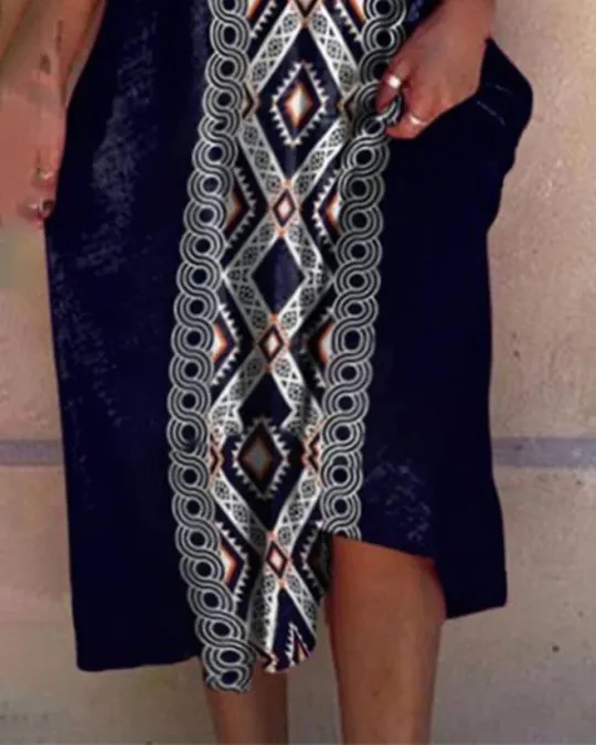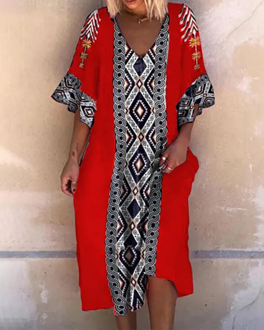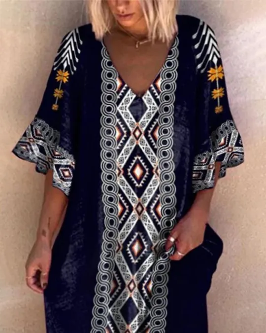 Bohemian Geometric Print Flared Sleeve Casual Maxi Dress